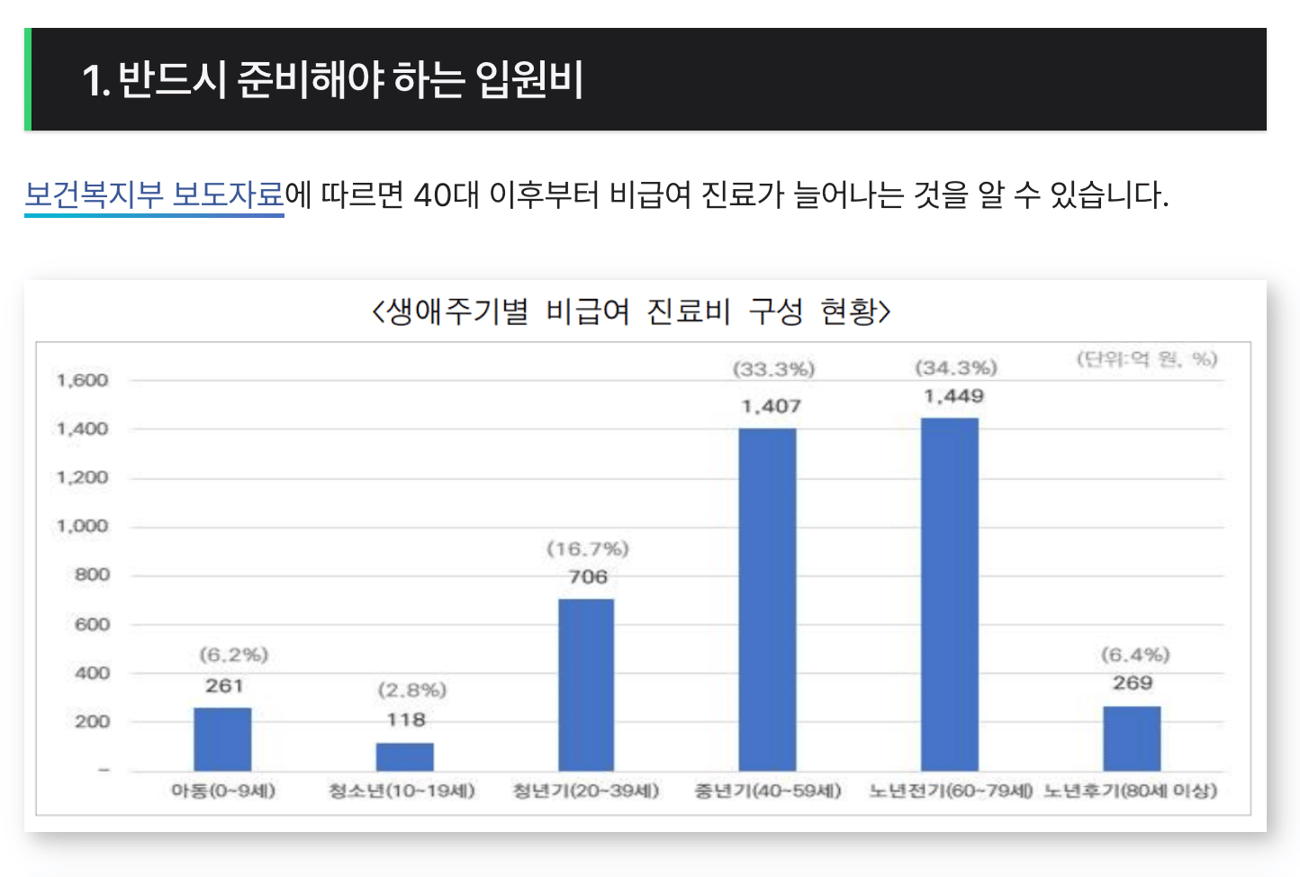 첫 번째, 연령별 비급여 자주 발생하는 비급여 항목 통계 자료를 보니 1인실 입원이 모두 포함돼 있더군요. 그래서 입원비에 포커스를 맞췄습니다.