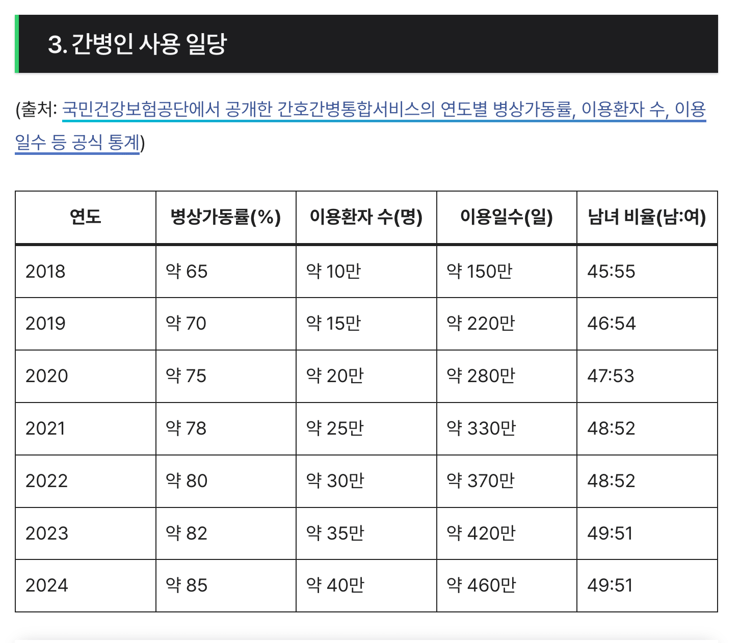 이 통계는 간병인 사용이라기 보다는 간호간병 통합병동 입원자 수 입니다. 이용일수는 총 인원의 입원일수 입니다.